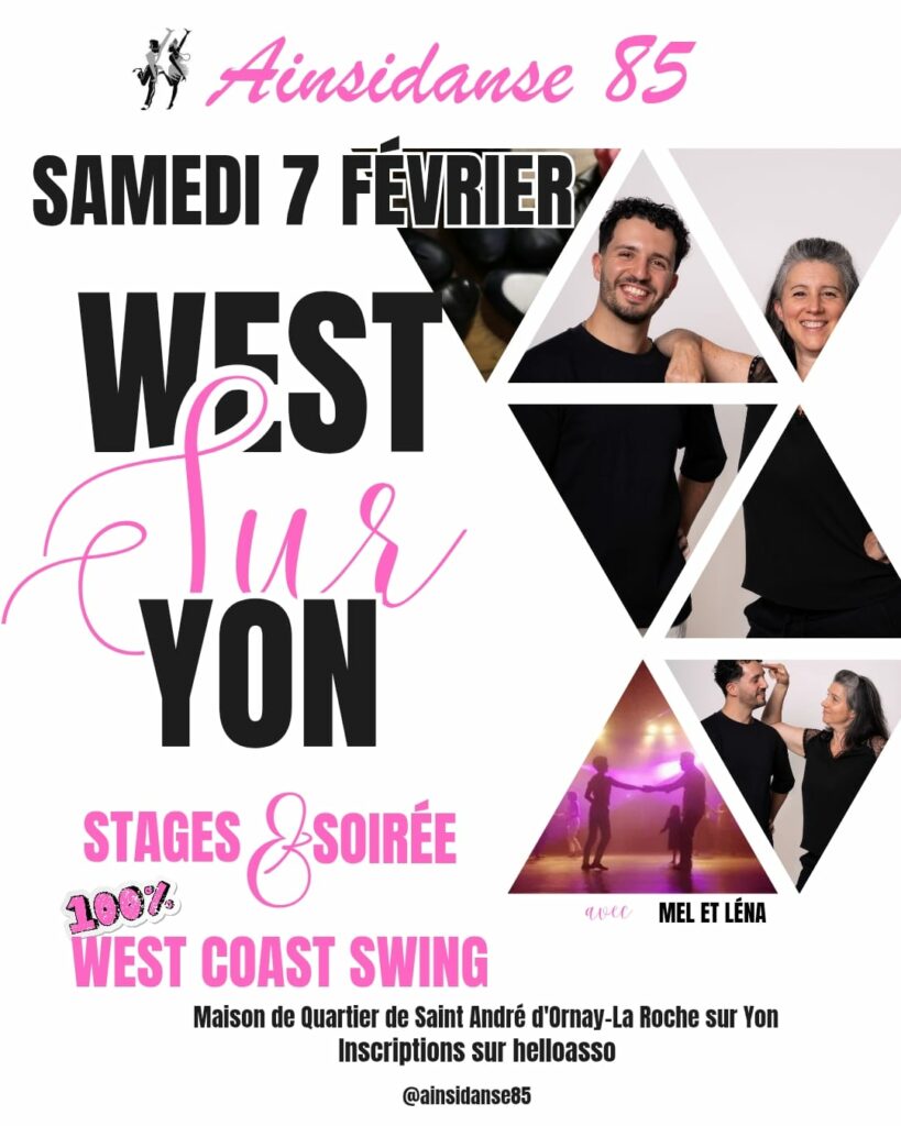 Ainsidanse danses à 2 Rock, Lindy, Balboa, West Coast du lundi au jeudi autour de Stéphane Nouvelle saison 2025-2026 reprise lundi 8 septembre Planning et inscription ici Le NAP 'SWING c'est fini, mais ... bientôt les photos dans la galerie notre prochaine matinale samedi 13 décembre Attention : la matinale petites accros est reportée en début 2026 Rendez-vous le mardi soir avec Odile pour faire chauffer vos pieds ! Nouvelle saison 2025-2026 reprise mardi 23 septembre Planning et inscription ici Des matinales le samedi Pour découvrir une nouvelle danse, améliorer votre style, ou tout simplement danser en bonne compagnie ! suivez la rubrique des actus et l'agenda consultez régulièrement la page "Les Actus", vous y trouverez toutes les dernières nouvelles. Suivez-nous contactez nous : ainsidanse85@gmail.com Évènements 7 février 2026 Le WEST sur YON est de retour !