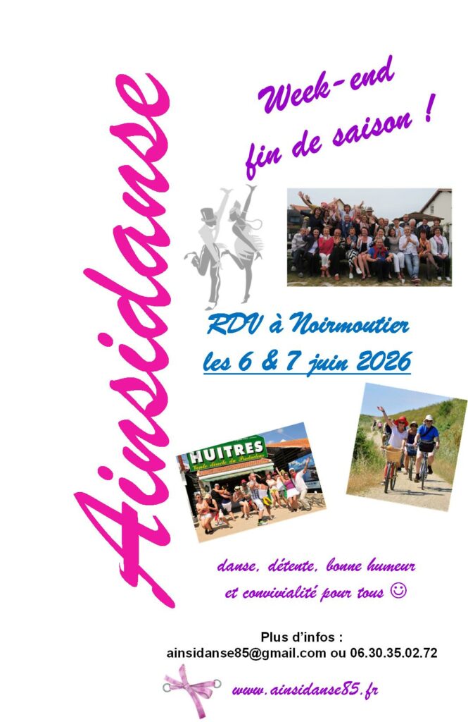 Ainsidanse danses à 2 Rock, Lindy, Balboa, West Coast du lundi au jeudi autour de Stéphane Nouvelle saison 2025-2026 reprise lundi 8 septembre Planning et inscription ici On continue en 2026 pour le plaisir de tous ! retrouvez ci-dessous nos futurs évènements : 1/ Notre prochaine soirée samedi 25 avril 2/ Notre RDV incontournable à Noirmoutier C'est le week-end du 6 et 7 juin 3/ Nos Journées "découverte" pour préparer la saison prochaine : c'est du 23 au 29 juin Et notez dès maintenant dans vos agendas samedi 17 Octobre 2026 ce sera le 6ème Cabaret... surprise 🙂 !!! Rendez-vous le mardi soir avec Odile pour faire chauffer vos pieds ! Nouvelle saison 2025-2026 reprise mardi 23 septembre Planning et inscription ici Des matinales le samedi Pour découvrir une nouvelle danse, améliorer votre style, ou tout simplement danser en bonne compagnie ! suivez la rubrique des actus et l'agenda consultez régulièrement la page "Les Actus", vous y trouverez toutes les dernières nouvelles. Suivez-nous contactez nous : ainsidanse85@gmail.com Évènements