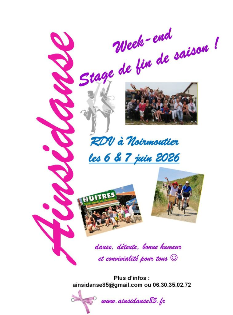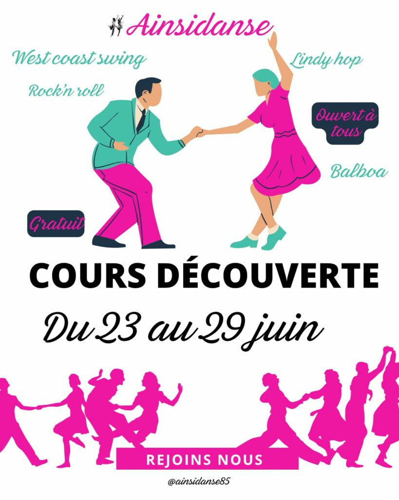 Ainsidanse danses à 2 Rock, Lindy, Balboa, West Coast du lundi au jeudi autour de Stéphane Nouvelle saison 2025-2026 reprise lundi 8 septembre Planning et inscription ici On continue en 2026 pour le plaisir de tous ! 1/ Notre prochaine soirée c'est le 25 avril prochain 2/ Notre RDV incontournable à Noirmoutier c'est le 6 et 7 juin , tous en stage ! ouverture des inscriptions bientôt... 3/ Nos Journées découverte pour préparer la saison prochaine : c'est du 23 au 29 juin Et notez dès maintenant dans vos agendas 17 Octobre 2026 ce sera le 6ème Cabaret... surprise 🙂 !!! Rendez-vous le mardi soir avec Odile pour faire chauffer vos pieds ! Nouvelle saison 2025-2026 reprise mardi 23 septembre Planning et inscription ici Des matinales le samedi Pour découvrir une nouvelle danse, améliorer votre style, ou tout simplement danser en bonne compagnie ! suivez la rubrique des actus et l'agenda consultez régulièrement la page "Les Actus", vous y trouverez toutes les dernières nouvelles. Suivez-nous contactez nous : ainsidanse85@gmail.com Évènements